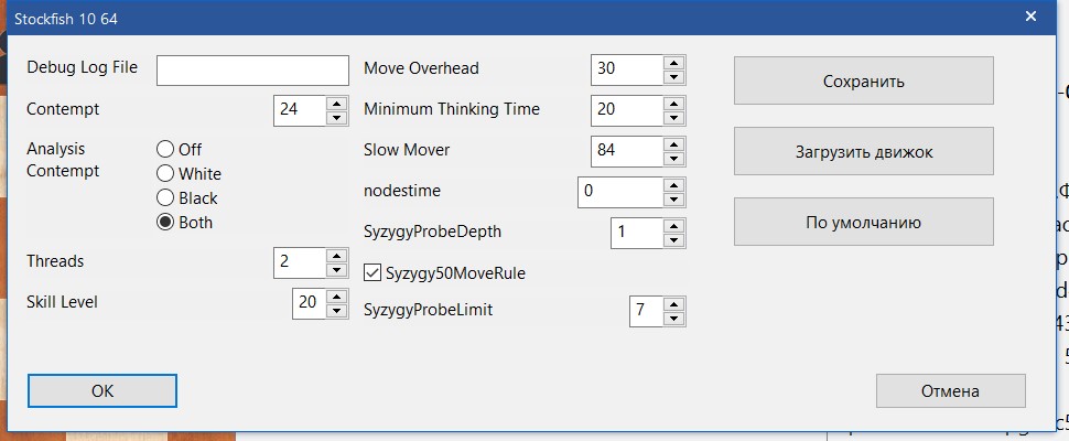 5. Откроется окно с настройками Stockfish 10. Здесь можно нажать ОК и перейти дальше, а настройки изменить позже.