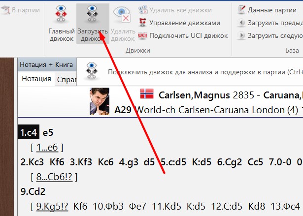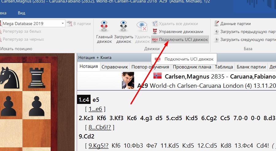 3. Теперь движок надо подключить. Для этого в ChessBase 15 откройте любую партию и нажмите на кнопку Подключить UCI движок, как показано на картинке ниже.