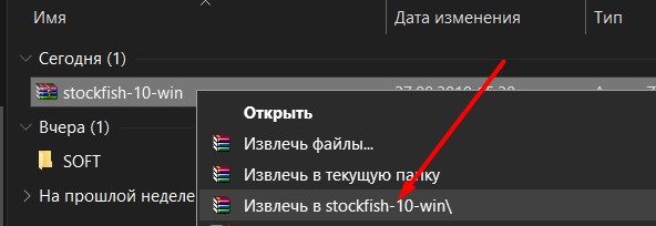 2. После нажатия кнопки Download архив с движком Stockfish 10 будет скачан на ваш компьютер. Далее разархивируйте его в удобное для вас место. Примерно, как показано на картинке ниже.